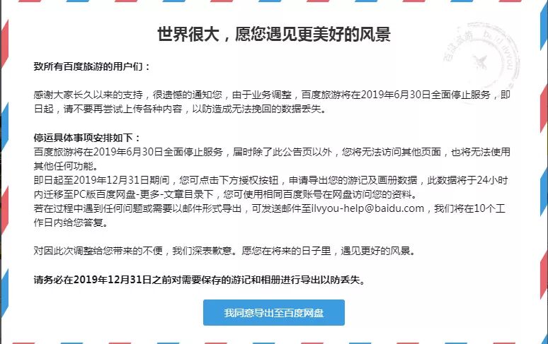 1.百度旅游:将在2019年6月30日全面停止服务。百度旅游在官网发布公告称,“由于业务调整,百度旅游将在2019年6月30日全面停止服务,即日起,请不要再尝试上传各种内容,以防造成无法挽回的数据丢失。”届时用户将无法访问其他页面,也将无法使用其他任何功能。