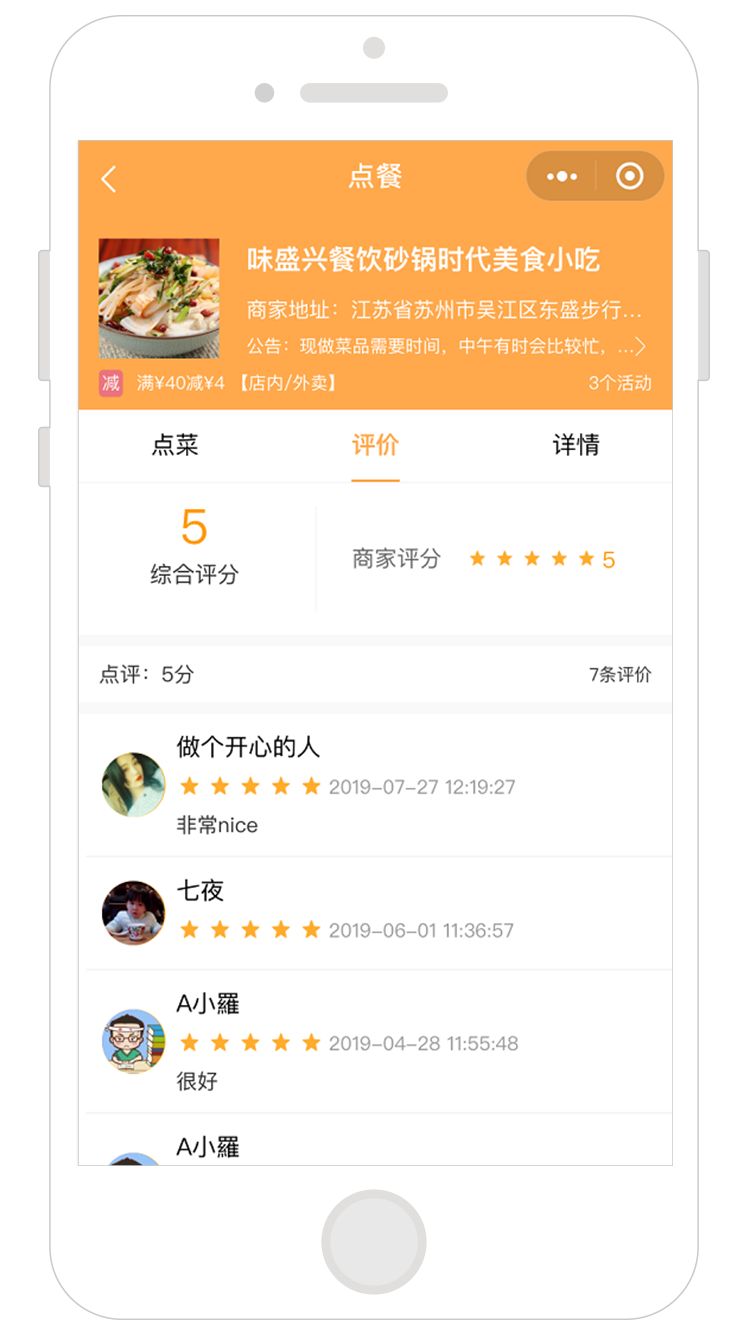 味盛兴餐饮小程序开通了线上评价功能,每一位线上消费的客户都可以在线点评打分,并实时展示,新用户进入店铺可随时查看评价,酒香不怕巷子深,好评能够促进更多客户下单。