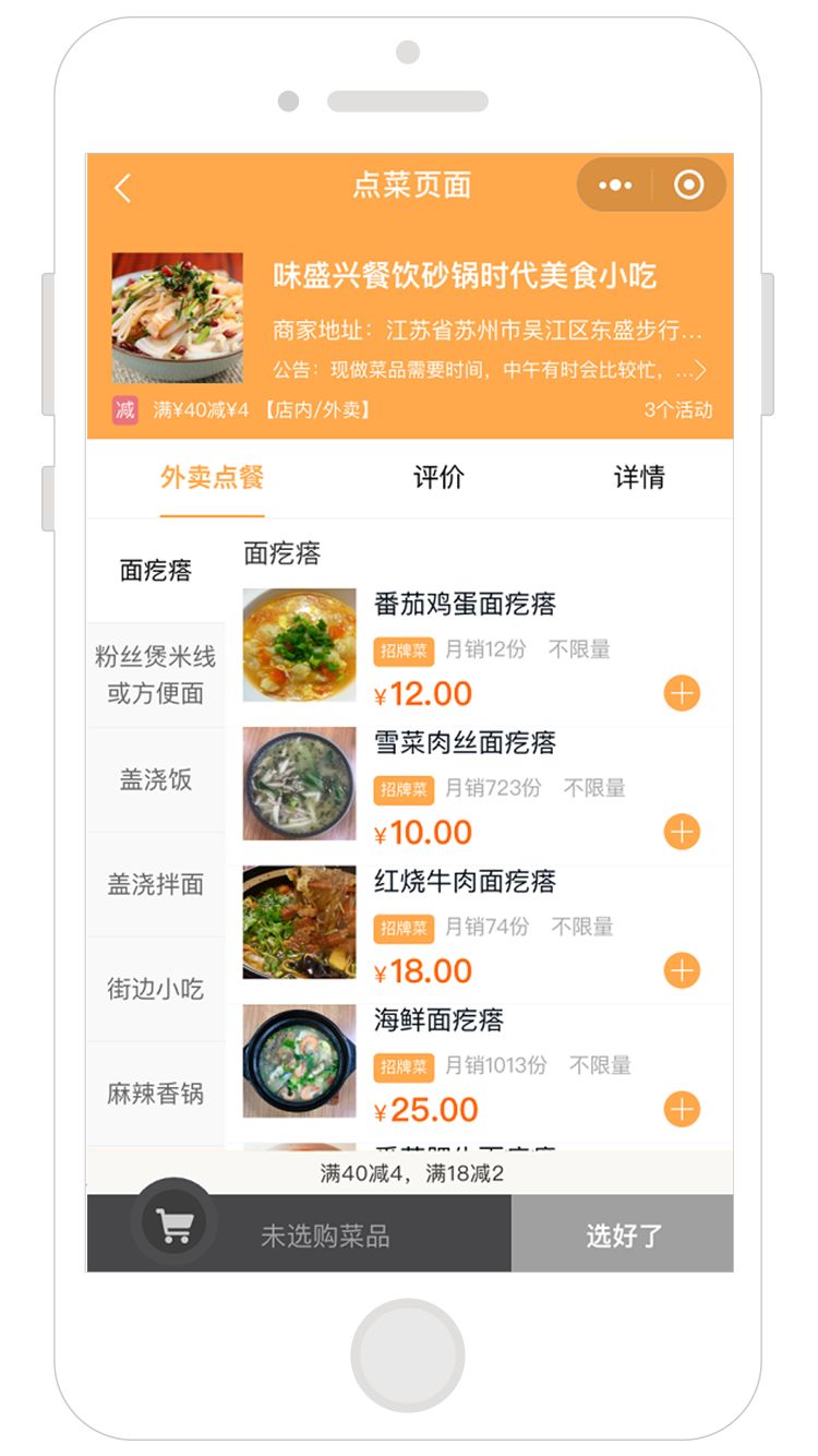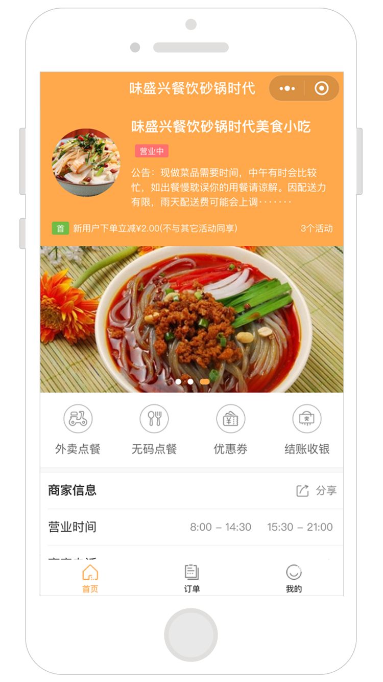 味盛兴餐饮小程序开通了优惠券的功能,新客户下单立减2元,老客户满18元减2元、满40减4元,所需支付成本并不高,再结合餐饮小程序的首页公告宣传,影响深远,让线下与线上相互引流,不再烦恼拓客问题。